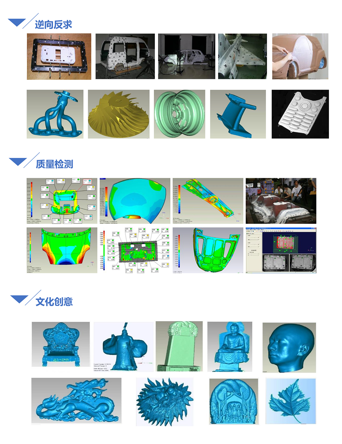 产品检测:生产线产品质量控制和形位尺寸检测,特别适合复杂曲面的检测,可以检测铸件、锻件、冲压件、模具、注塑件、木制品等产品。