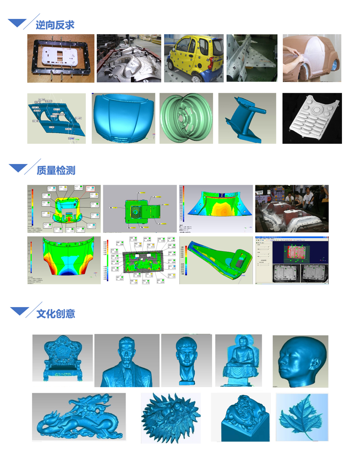 产品检测:生产线产品质量控制和形位尺寸检测,特别适合复杂曲面的检测,可以检测铸件、锻件、冲压件、模具、注塑件、木制品等产品。